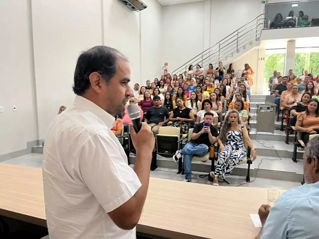 Nesta segunda-feira, 17 de fevereiro, o Prefeito Hélio Acosta, acompanhado da Secretária de Educação Tayza Gonçalves Acosta, do Presidente da Câmara de Vereadores Claudenir Costa de Oliveira, conhecido como Chacal, de coordenadores e dos vereadores Professora Beth e Robson Drew Fernandes, reuniu-se com os professores da rede municipal de ensino para um momento de acolhimento e alinhamento.